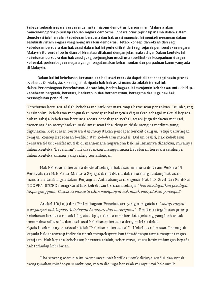 Hak bersuara berhimpun dan berpersatuan Independent Police Complaints and Misconduct Commission Tolak undang-undang dua darjat Isu. Salah satu kebebasan asasi adalah kebebasan bercakap berhimpun dan berpersatuan yang. Peristiwa berdarah 13 Mei 1969 menyebabkan Parlimen pada tahun 1967 telah meluluskan akta meminda Perkara 10 Perlembagaan Malaysia mengenai kebebasan bersuara berhimpun dan berpesatuan.